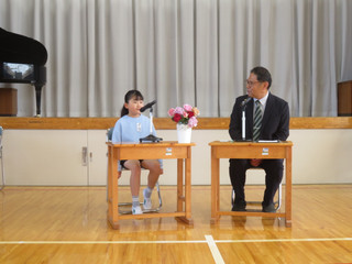 ゴールデンウィーク明けの朝会は、子供たちや先生にインタビューをする企画で朝会を行いました。