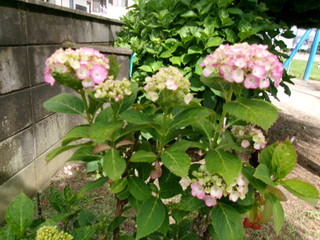 毛野南小には、様々な種類のアジサイがあり、少しずつ咲き始めています。